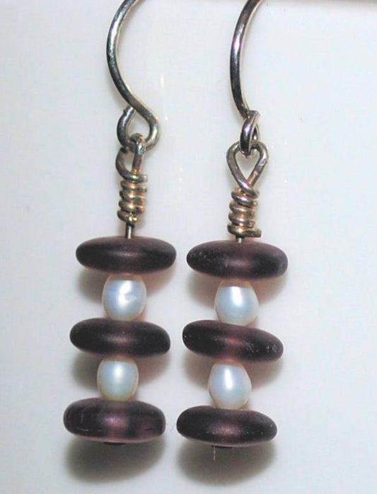 White Freshwater Pearl and Dark Purple Frosted Czech Glass Dangle Earrings