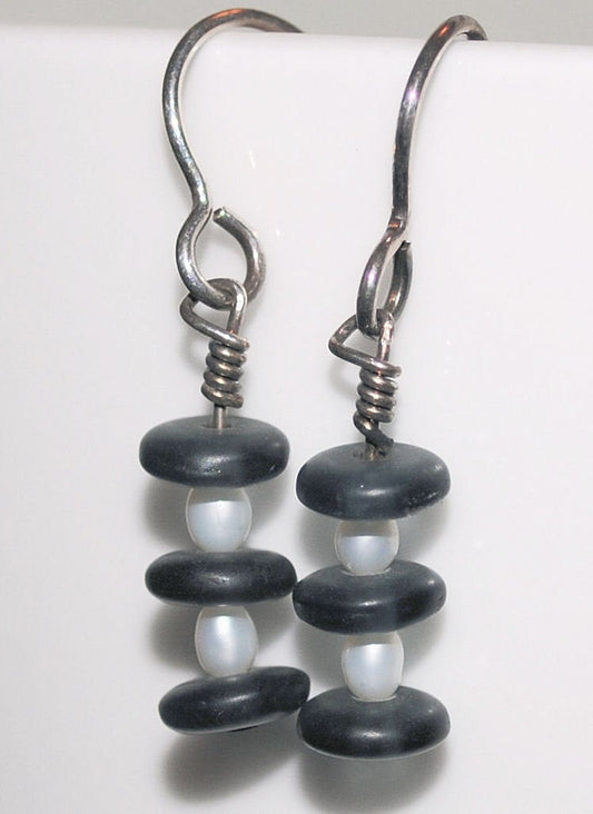 White Freshwater Pearl and Smoky Gray Czech Glass Dangle Earrings