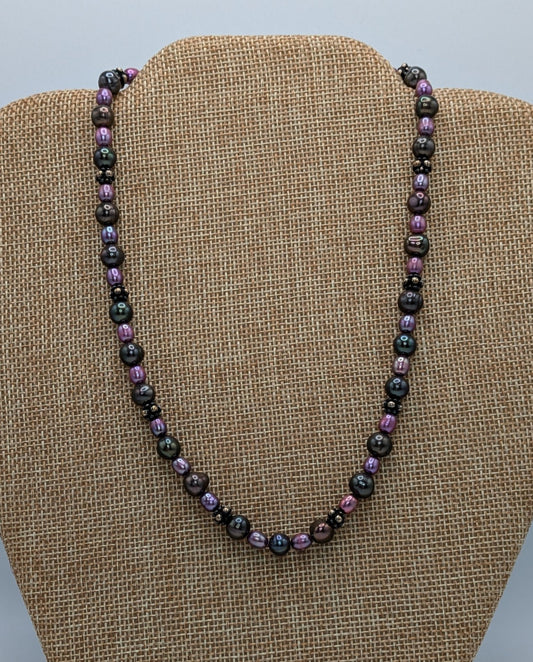 Pink and Peacock Freshwater Pearl Necklace with Sterling Silver Bali Beads
