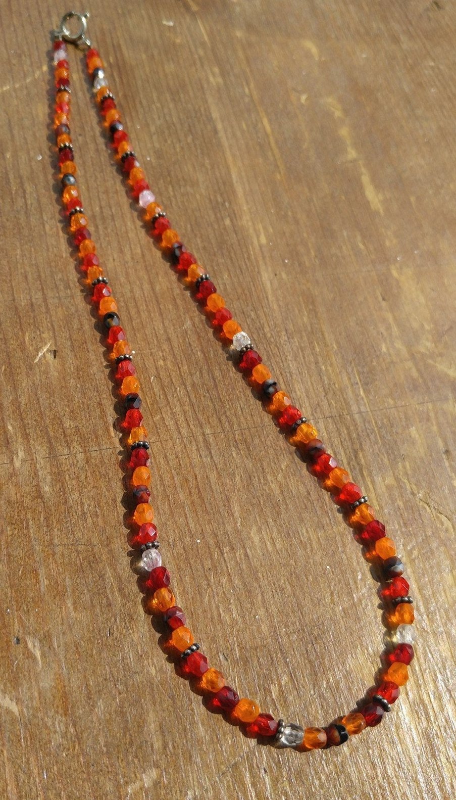 Shades of Red and Orange Czech Glass Necklace with Sterling Silver Bali Beads